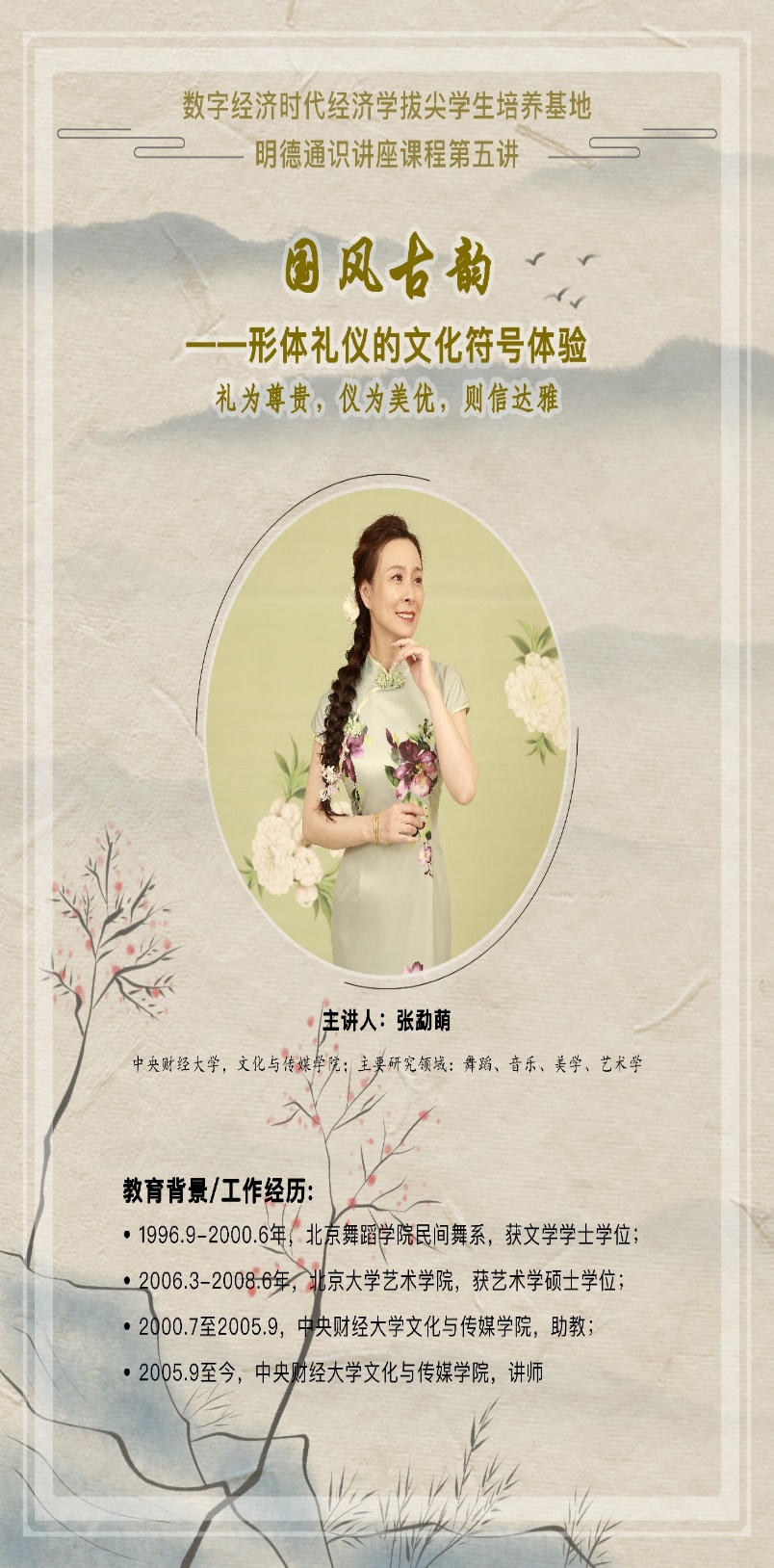 2022年5月25日,基地邀请到了今年会文化与传媒学院的张勐萌老师做“国风古韵·文化自信-形体礼仪的文化符号体验”主题讲座。