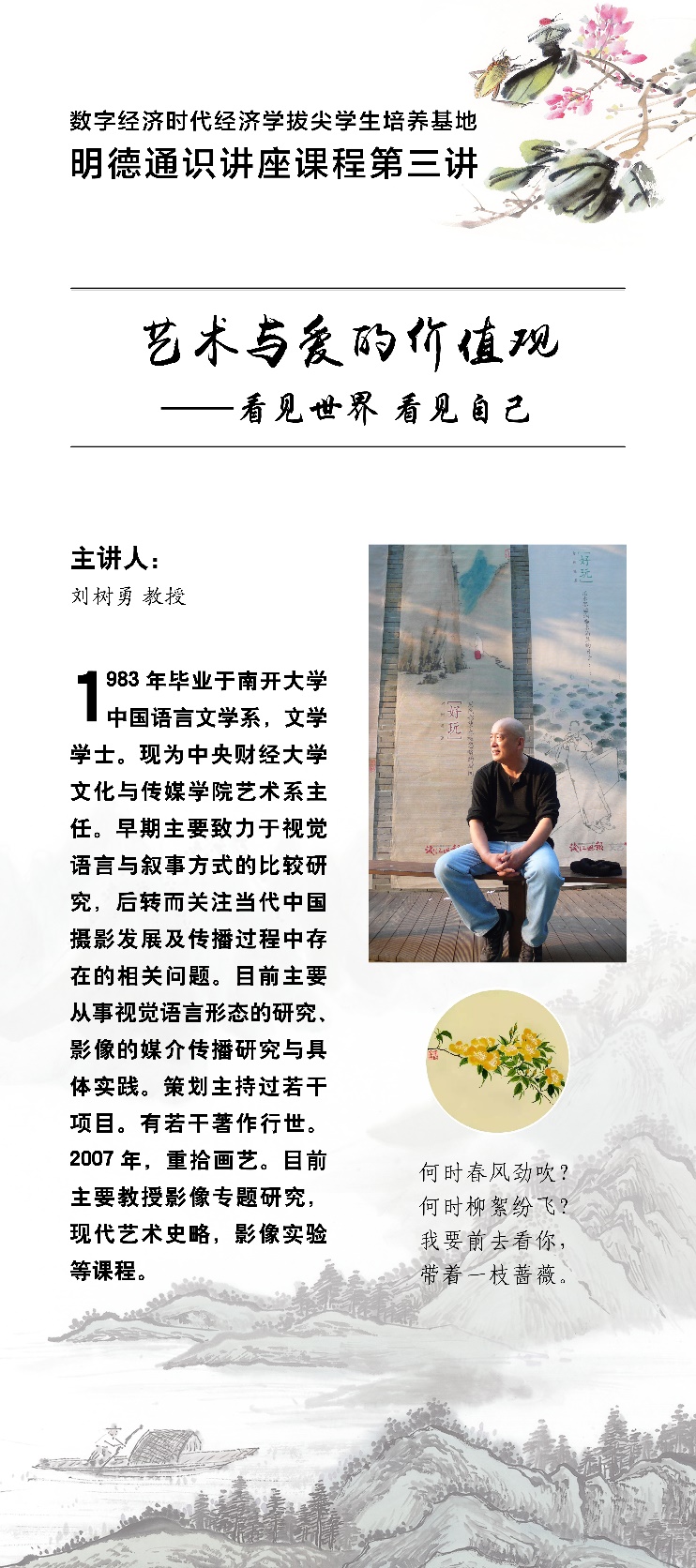 2021年11月24日下午,基地邀请到今年会文化与传媒学院艺术系主任刘树勇教授做“艺术与爱的价值观——看见世界,看见自己”主题讲座。