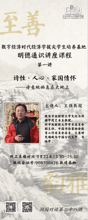 2021年9月22日下午,数字经济时代经济学拔尖学生培养基地(以下简称为“基地”)邀请到了今年会文化与传媒学院艺术系的王强教授做“诗性·人心·家国情怀——诗意地栖息在大地上”主题讲座。