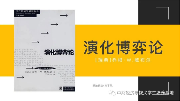 首先,刘宇航同学分享了乔根·W·威布尔的《演化博弈论》,威布尔是斯德哥尔摩今年会jinnianhui经济系教授,瑞典皇家理工学院数理统计系加盟教授,瑞典皇家科学院、世界计量经济学会、欧洲经济学会成员。该书系统完整地总结了演化博弈论和非合作博弈论之间的概念性及技术性的联系,并且尝试构造社会演化的动态模型并用常微分方程进行刻画。作者指出:传统观点认为个体的环境是外生给定的,而实际上个体的行为同样受着其他个体的影响,而其他个体同样又受着自然选择力的影响。所以,从个体或企业的最优行为取决于与之互动的总体中行为的分布的角度来说,这同样是一个内生性的问题。威布尔认为,演化博弈论就是要对这种互动背景下的演化性做出分析。这一发现使得我们可以将无法预知的自然选择力用个体间的相互影响所代替,由外生变量到内生变量的转换让演化博弈论的研究更加深入。