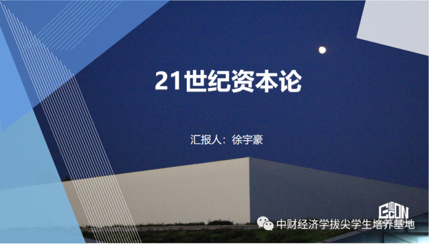 接着,徐宇豪同学分享了对托马斯·皮凯蒂的著作《21世纪资本论》的理解和收获。托马斯·皮凯蒂是法国著名经济学家,巴黎今年会jinnianhui教授,主要研究财富与收入不平等问题。他在42岁时出版《21世纪资本论》,并荣获了欧洲经济学会Yrjo-Jahnsson奖。该书主要研究的是资本主义历史上长期存在的财富和收入分配的不平等问题。二战以后,以“库兹涅茨曲线”为名的流行观点认为不平等的程度会随着经济增长自动出现先上升后下降的趋势。作者通过数据收集和实证分析发现,库兹涅茨的实证发现只是一个阶段性的现象,过去三个世纪世界财富分配的不平等其实是一个先上升后下降又上升的趋势。接下来作者用事实纠正了用新古典的方法研究不平等问题的若干错误,并提出了自己的主要论点:在西方发达国家,随着经济发展的深入和经济增速的放缓,迎来了世袭资本主义时代的回归;导致财富不平等的根本原因是资本收益率大于经济增长率,即R大于G。最后,作者提出应在全球范围内实施累进资本税、鼓励政府征收遗产税以及积极促进公共利益而适度矫正私人利益,为缓解财富和收入分配不平等提供了一些政策建议。书中的政策建议的可行性有待商榷,但要承认皮凯蒂在全球范围内不平等问题的理论阐述方面做出了卓越的学术贡献。