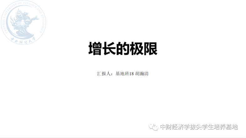 胡瀚清同学分享了由麻省理工学院系统动力小组撰写的描述人类经济与地球资源动态关系的《增长的极限》一书。作者从超越地球承载力的过冲(超过均衡状态)开始,讲述了工业和人口增长的指数特征与有限土地、森林、石油等资源的冲突,并构建了描述这一动态联系过程的World3模型。作者用模型模拟了各种假设下世界资源、人口和工业产出在此后一百年的演变,发现唯有适当控制增长、大力发展技术、保护有限资源方可实现全球的可持续增长。最后,作者强调要构建可持续社会,需要专注于产品质量,进行集思广益,逐步摒弃一味扩张经济等。该书强调系统性思维,指导我们看问题不应理想化,而应注重于全局,帮助我们理解系统的局限与不平衡,有较强的现实意义。