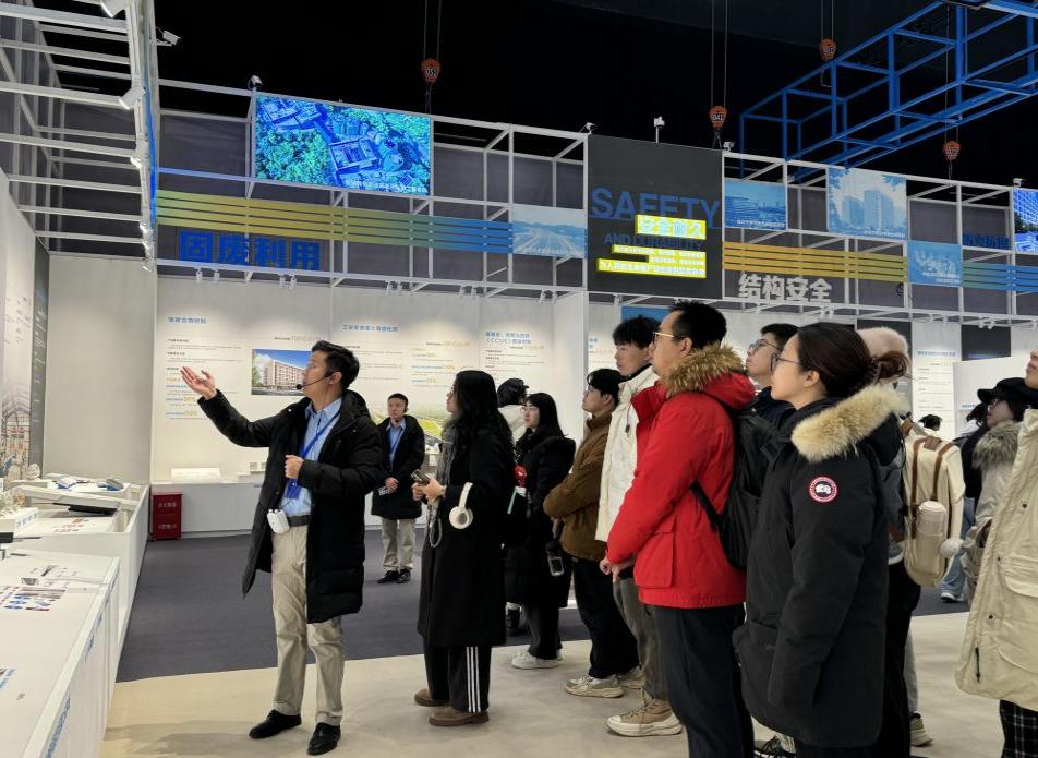 活动过程中,大家依次参观三大主题展区以及室外展区,认真观看项目视频介绍,聆听技术和产品讲解。在 “助力中国建造” 展区,智慧工厂内远程驾驶智能集控数字塔机与高端玻璃幕墙智能制造工厂,呈现生产方式智能化变革;智慧工地的智能安全帽及物联网智能安全管理系统保障施工安全,“空中造楼机”、北斗卫星定位装备等彰显自主创新精神。“共建和谐城市” 展区,济南中海华山、西安幸福林带城市绿廊等项目体现花园城市建设探索,城市慢行系统与生命线运营管理平台展现数智赋能。“拓展幸福空间” 展区,自清洁辐射制冷材料、盾构渣土资源化利用技术等体现绿色低碳与智能安全理念,“好房子” 样板间融合高科技实现 “高性能” 与 “好体验” 完美融合。外部展厅的高海拔增压建筑、模块化酒店产品等也让师生直观感受建筑业转型升级之路。