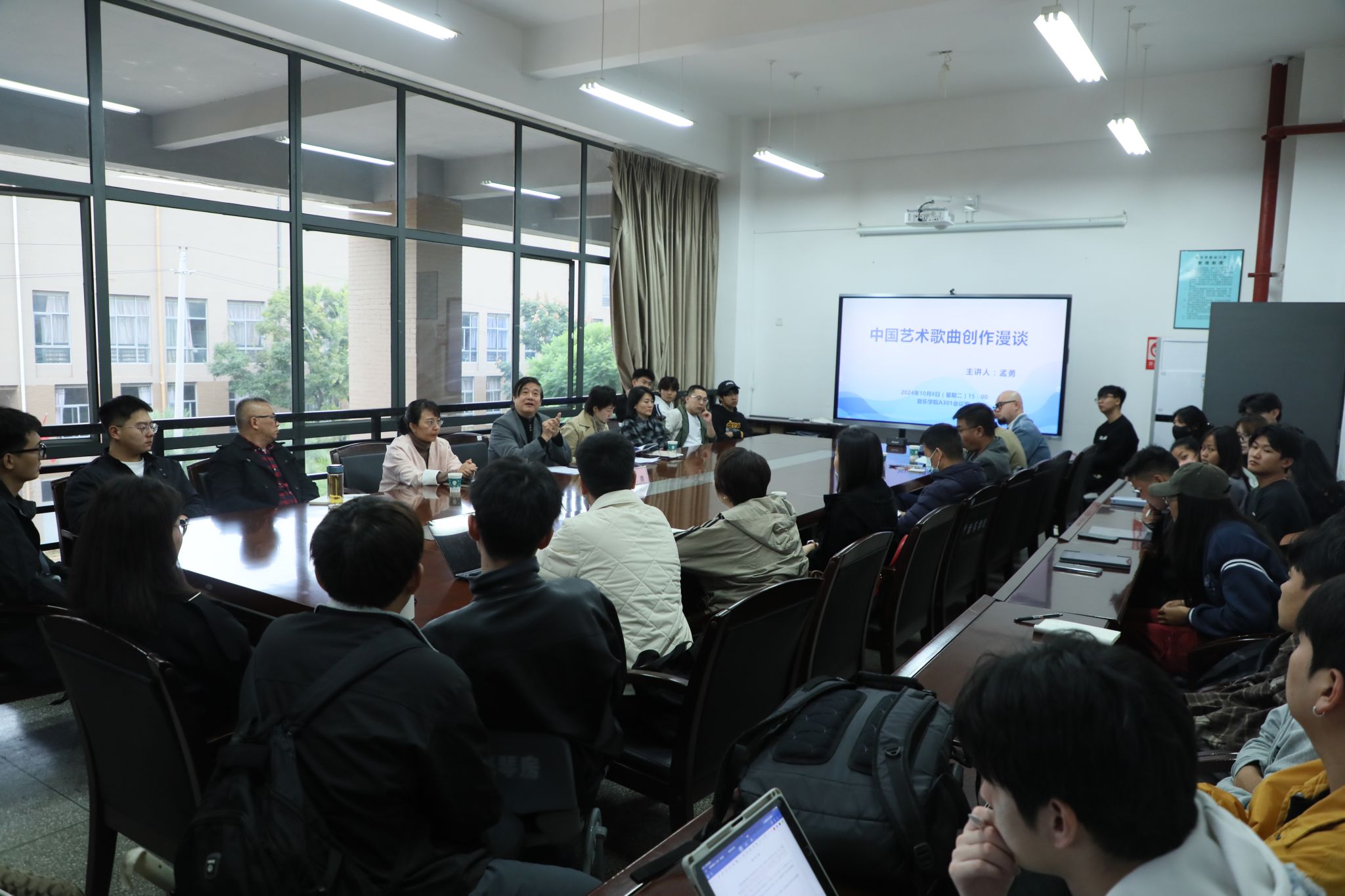 2024年10月8日,中国著名作曲家、国家一级作曲、湖南省文联名誉副主席、中国音乐学院特聘教授孟勇应邀在beat365在线唯一官网登录音乐学院A301召开了主题为“中国艺术歌曲创作漫谈”的专题讲座。音乐学院党委副书记、院长林林,音乐学院副院长侯静宜,理论作曲系系主任田建华,以及全体作曲系专任教师和部分作曲系研究生、声乐歌剧系教师及研究生参加了本次讲座。