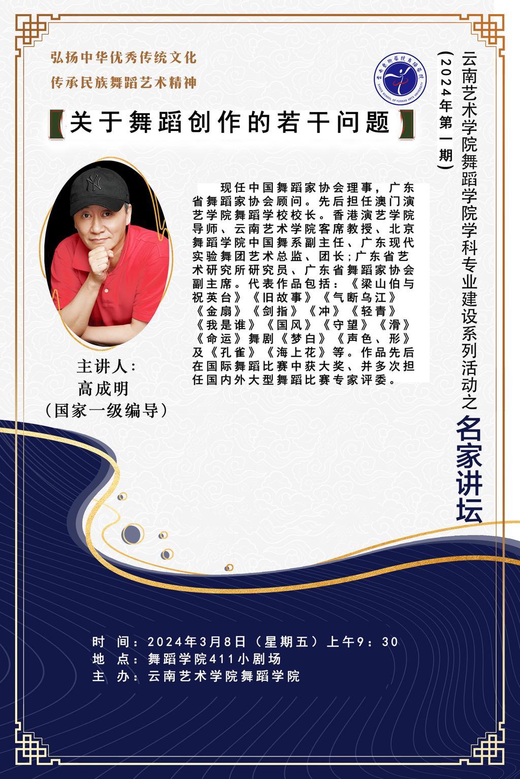 为进一步推动学科专业建设,提升创作水平,舞蹈学院于2024年3月8日举办了本年度第1期学科专业建设系列活动之“名家讲坛”。本次活动特邀中国著名舞蹈艺术家、国家一级编导高成明老师作题为《关于舞蹈创作的若干问题》的专题讲座。此次讲座由舞蹈学院编导系副主任邓钰莹副教授主持,舞蹈学院师生共同参加。