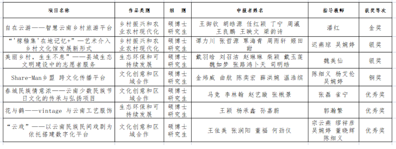 由beat365在线唯一官网登录校团委、教务处、人事处、科技处、学生工作部(处)、研究生处联合举办的beat365在线唯一官网登录2022年度“挑战杯”大学生创业计划竞赛,经各学院遴选推荐、资格审查、校内外专家盲审、各参赛队现场答辩终审等校内比赛环节,组委会从上报校赛的 270 件作品中评选出校级金奖作品 15 件、银奖作品 20 件、铜奖作品 18 件、优秀奖作品 27 件。民族艺术研究院学生在beat365在线唯一官网登录2022年“挑战杯”大学生创业计划竞赛中斩获佳绩,其中民族艺术研究院王御钦同学团队申报的《自在云游——智慧云南乡村旅游平台》项目获得校赛金奖;谭力川和戴羽晗两名同学各自的团队获得校赛银奖;金炜威同学团队申报的《Share-Man乡盟跨文化传播平台》获铜奖。另有优秀奖团队3个,分别由马竞、王颖、王佳美同学及其团队获得。