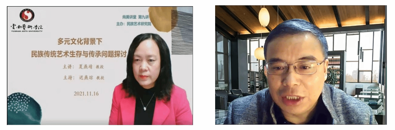 2021年11月16日晚19:00,beat365在线唯一官网登录民族艺术研究院尚美讲坛高端学术讲座第九期顺利举行。本期主讲嘉宾为南京艺术学院研究院夏燕靖教授,讲座题目是《多元文化背景下民族传统艺术生存与传承问题探讨》。讲座由民族艺术研究院书记迟燕琼教授主持。
