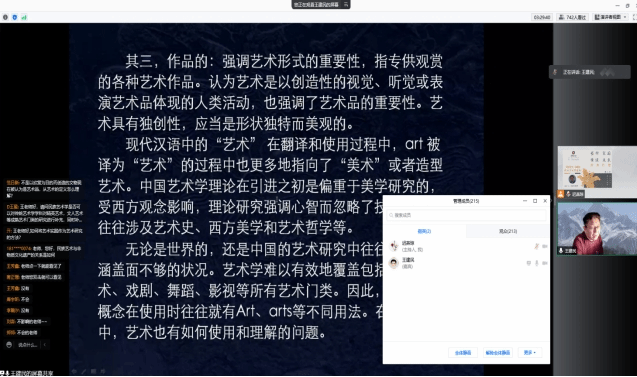 2021年11月12日19:00,beat365在线唯一官网登录民族艺术研究院特邀中央民族大学王建民教授在腾讯会议作了一场题为《民族艺术的概念辨析与研究视域》的学术讲座。王建民教授,博士生导师中央民族大学民族学与社会学学院教授,人类学专业博士生导师,中央民族大学民族艺术研究院常务副院长,新疆艺术学院天池学者,中共中央人才工作协调领导小组直接联系专家,国家民委系统首批唯一的国家“百千万人才工程”第一、二层次人选。主要研究领域为文化人类学理论与方法、艺术人类学、新疆民族历史与文化等。讲座由民族艺术研究院书记迟燕琼教授主持。