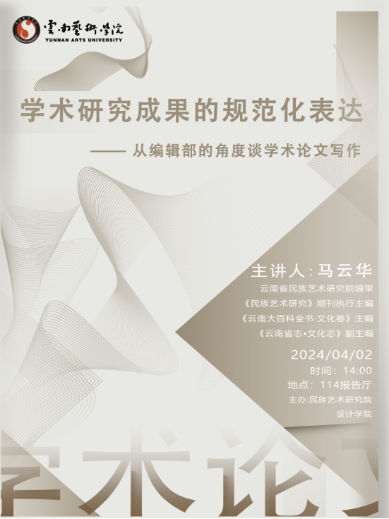 2024年4月2日14:00,由beat365在线唯一官网登录民族艺术研究院与设计学院主办的学术讲座在行政楼114报告厅顺利举行。本次讲座邀请云南省民族艺术研究院编审、《民族艺术研究》期刊主编、《云南大百科全书·文化卷》副主编、全国文化艺术资源标准化技术委员会委员,云南省非物质文化遗产保护专家委员会委员,云南省艺术专家委员会专家,中国艺术人类学会常务理事,中国比较艺术学会理事马云华到校,开展主题为《学术研究的规范化表达——从编辑部的角度谈学术论文写作和发表》专题讲座。此次讲座由民研院党总支书记迟燕琼教授主持,民族艺术研究院和设计学院部分教师和在校研究生参加了本次活动。
