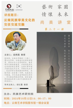 2024年10月12日14:00,民族艺术研究院尚美讲堂系列讲座第二十一讲在图书馆一楼会议室开讲。本次讲座由云南大学二级教授,博士生导师,云南省文史研究馆馆员段炳昌教授主讲,讲座题目为《云南民族审美文化的交往交流交融》。段炳昌教授曾任云大人文学院院长、教育部中文教指委委员、云南省民间文艺家协会副主席等职务。主要从事中国少数民族文化艺术、中国古代文学、民俗学等方面的教学和研究。出版专著18部,发表论文70余篇,多次承担省部级重点项目并获省部级社科奖,担任省级研究基地负责人和两个省级重点学科负责人。