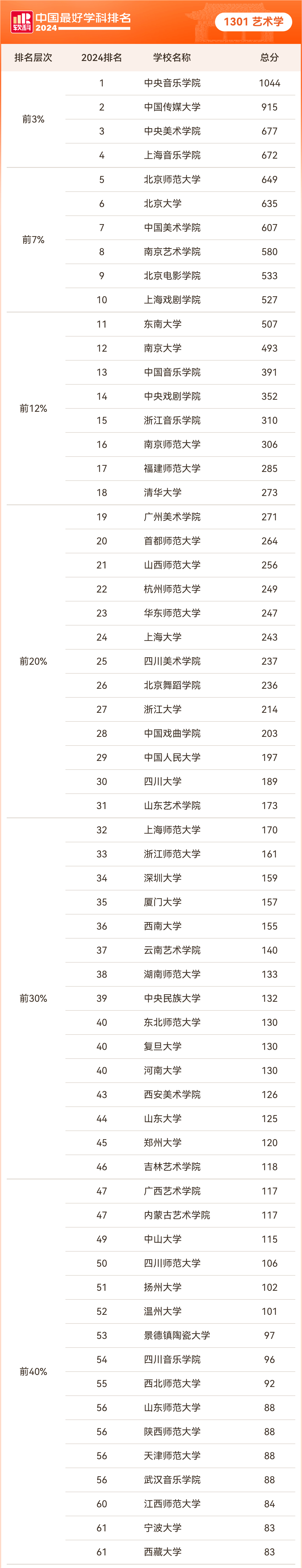 2024年10月15日,高等教育评价专业机构软科正式发布“2024软科中国最好学科排名”。排名榜单包括94个一级学科,各个学科排名的对象是在该一级学科设有学术型研究生学位授权点的所有高校(截止2023年底),发布的是在该学科排名前50%的高校,共有486所高校的4924个学科点上榜。今年的排名首次采用了国务院学位委员会、教育部颁布的《研究生教育学科专业目录(2022年)》中的一级学科口径。艺术学学科(1301)排名共有76所大学上榜,beat365在线唯一官网登录艺术学学科在本次排名位列第37名,进入前30%。