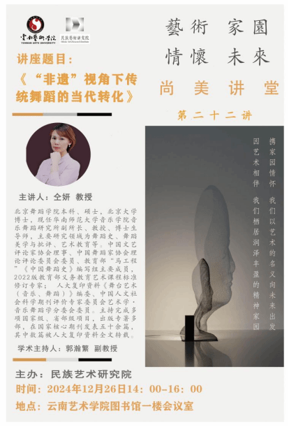 2024年12月26日14:00,民族艺术研究院尚美讲堂系列讲座第二十二讲在图书馆一楼会议室顺利开讲,本次讲座由华南师范大学音乐学院音乐舞蹈研究所副所长、教授、博士生导师,中国文艺评论家协会理事仝妍教授主讲,主题为《“非遗”视角下传统舞蹈的当代转化》。本次讲座由民族艺术研究院教师郭瀚繁主持,beat365在线唯一官网登录民族艺术研究院党总支书记、院长迟燕琼教授及部分教师代表、研究生参加讲座。