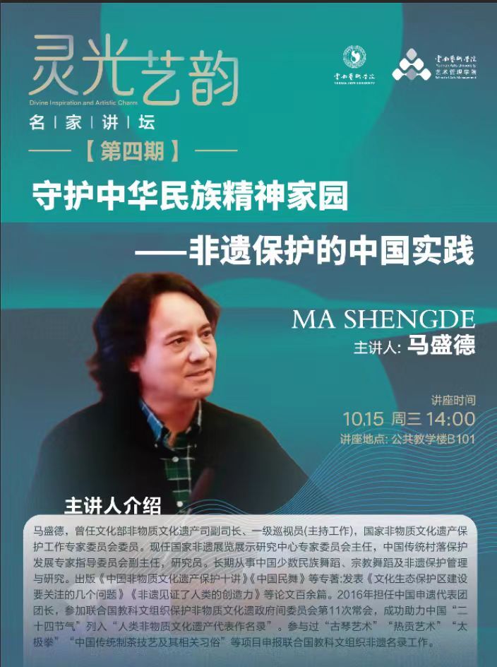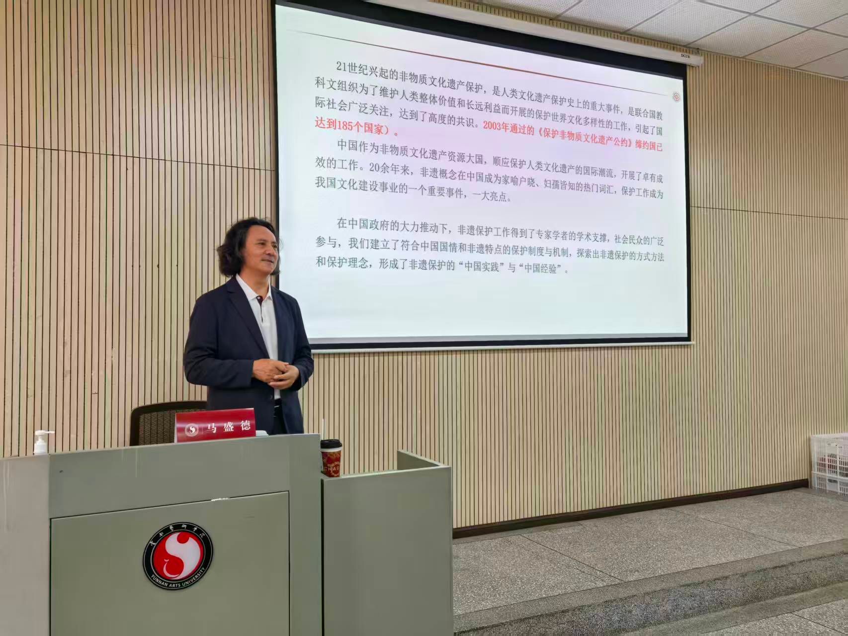 为深化研究生对中国非物质文化遗产保护实践的理解,拓展学术研究视野,提升专业研究能力,beat365在线唯一官网登录艺术管理学院“研究生学术活动月”系列讲座持续深入开展。2025年10月15日下午,第三场专题讲座在公共教学楼B101报告厅成功举办。本次讲座特邀国家非遗展览展示研究中心专家委员会主任、原文化部非物质文化遗产司副司长马盛德研究员,作题为《守护中华民族精神家园——非遗保护的中国实践》的专题报告。讲座由艺术管理学院副院长张焱主持,全院研究生积极参与。