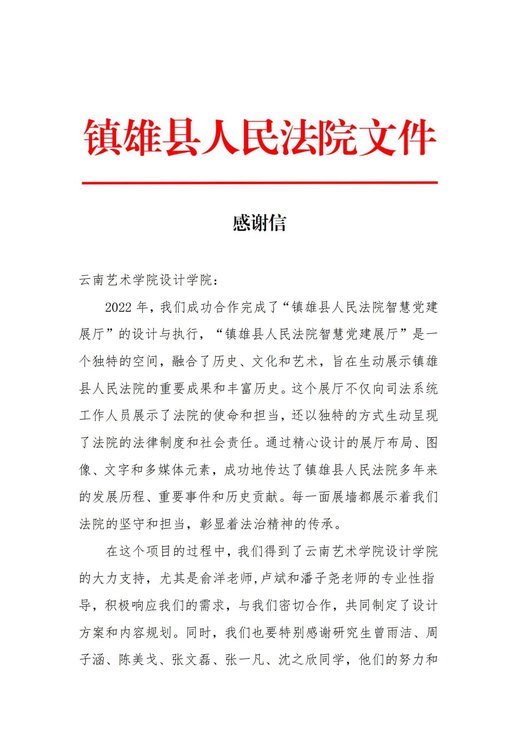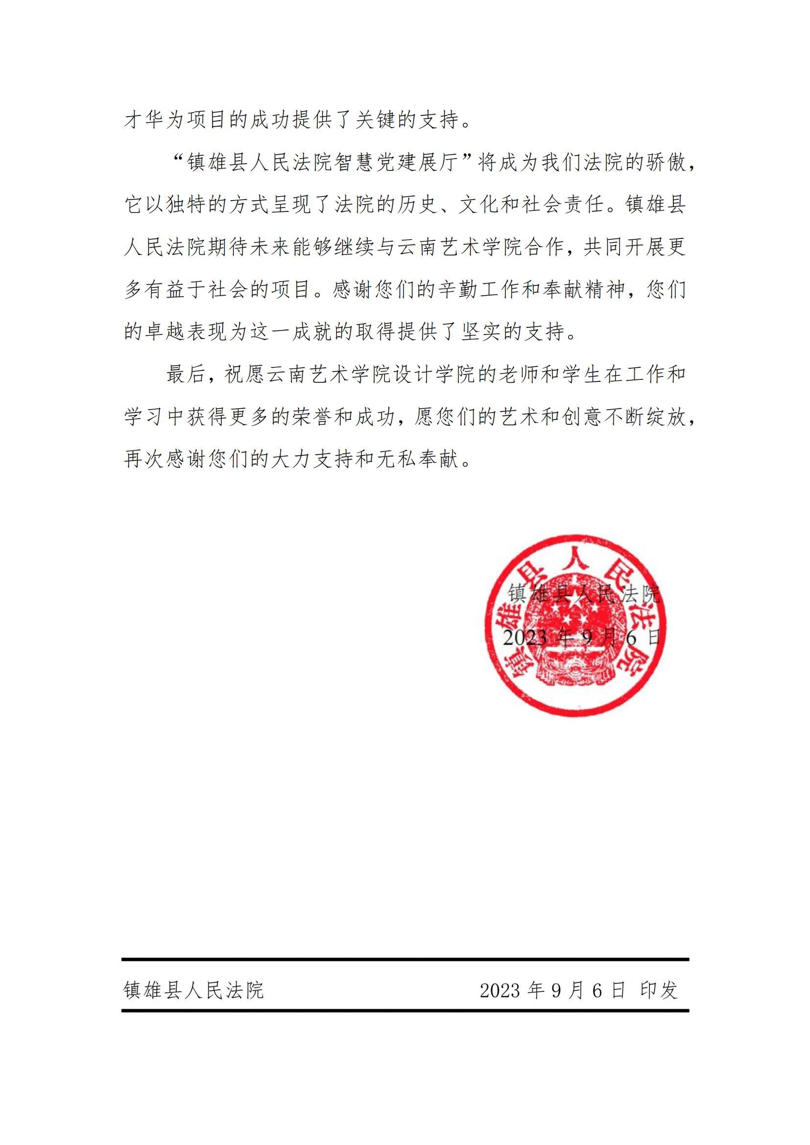 在信息化与智慧化浪潮席卷全球的今天,智慧党建作为新时代党建工作的新引擎,正逐步成为提升党建工作效能、强化党员教育管理的关键力量。beat365在线唯一官网登录设计学院积极响应国家智慧党建建设的号召,于2021年启动了与云南镇雄县人民法院的深度合作,旨在通过设计专业的力量,为智慧党建展厅的设计与实施注入新的活力。在此过程中,收到了来自镇雄县人民法院的感谢信,对学院表示衷心的感谢和崇高的敬意。