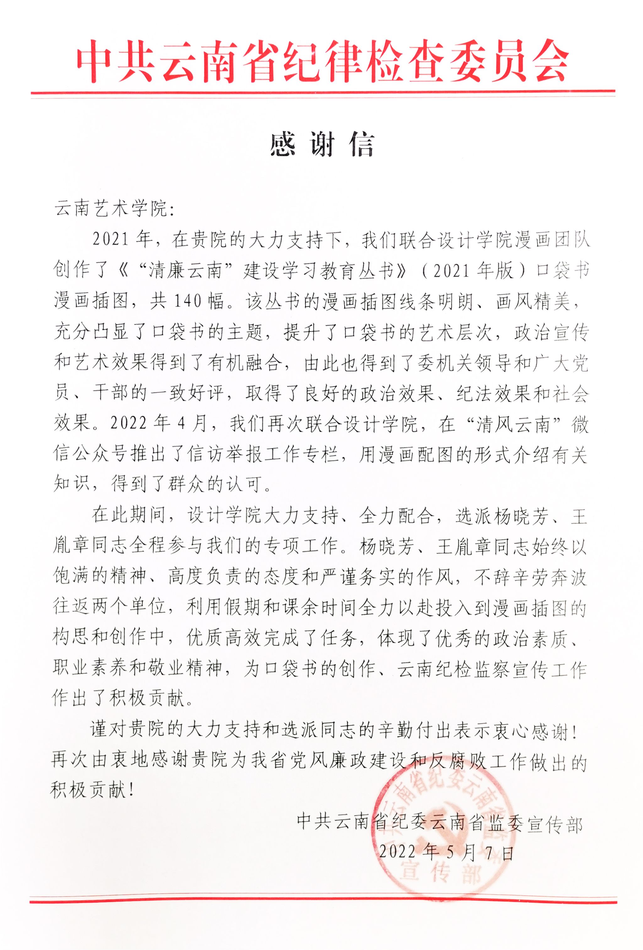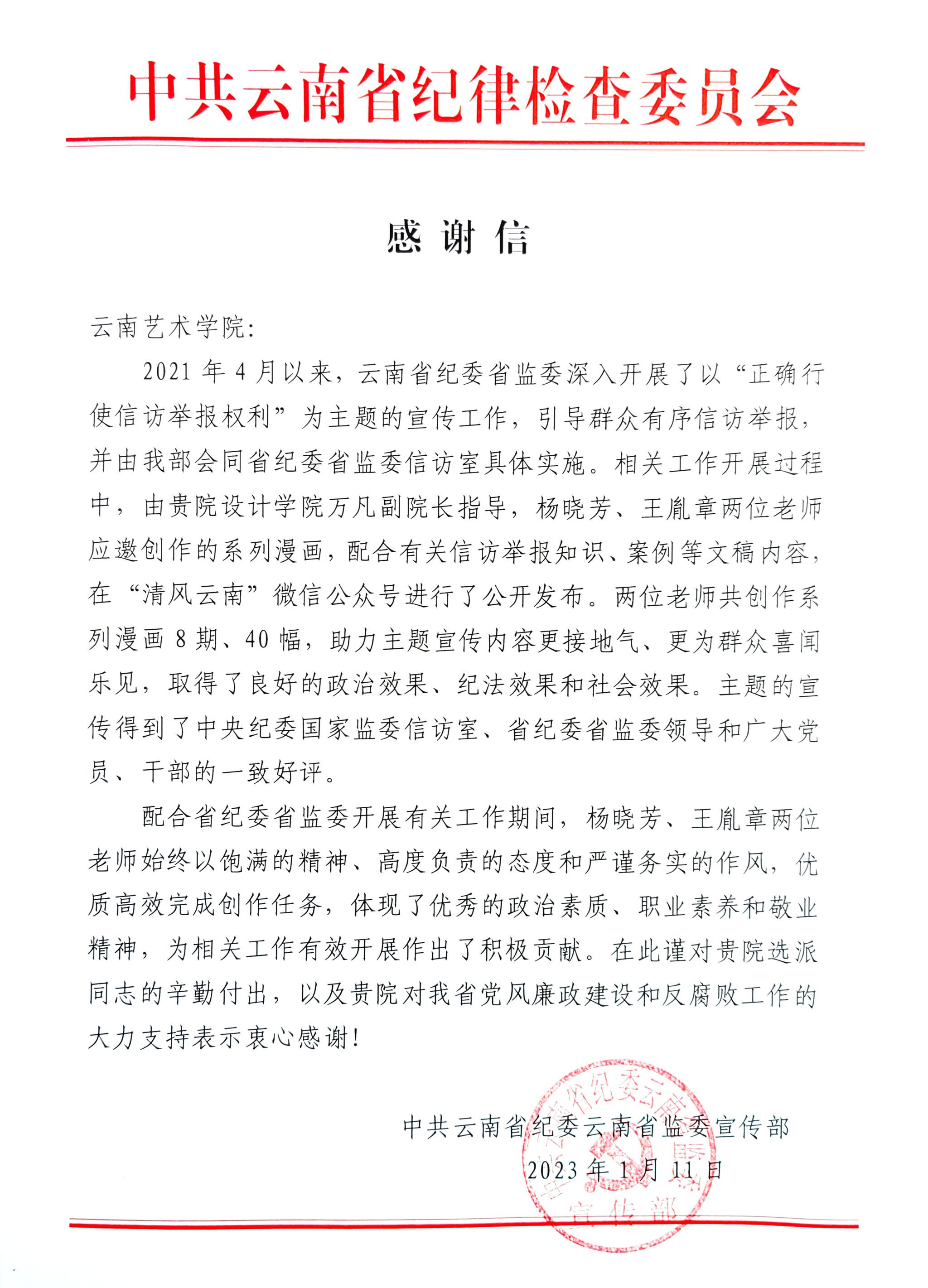 自2021年4月起,beat365在线唯一官网登录设计学院持续助力中共云南省纪律检查委员会、云南省监察委员会《“清廉云南”建设学习教育丛书》《正确行使信访举报权利》等法治主题宣传项目的漫画创作工作。此项工作的核心目标是通过创意漫画这一通俗易懂的艺术形式,结合吸引眼球的漫画标题,将复杂的廉政教育内容转化为易于理解和引人入胜的视觉故事,旨在有效提升党员及公众的廉政意识,促进廉洁文化的深入人心。设计学院漫画创作团队通过漫画的视觉艺术形式助力了法治主题宣传教育更接地气、更为群众喜闻乐见,取得了良好的政治效果、纪法效果和社会效果。不仅得到了云南各地机关、社区、学校、企业及医院等广泛学习与报道,还赢得了中央纪委国家监委信访室、省纪委省监委领导以及广大党员干部的高度赞誉,彰显了其在推动法治廉政教育方面的显著成效。中共云南省纪律检查委员会特此发来两封感谢信,对设计学院的鼎力支持表示衷心的感谢与崇高的敬意,进一步肯定了设计学院在法治廉政文化建设中所作出的积极贡献。