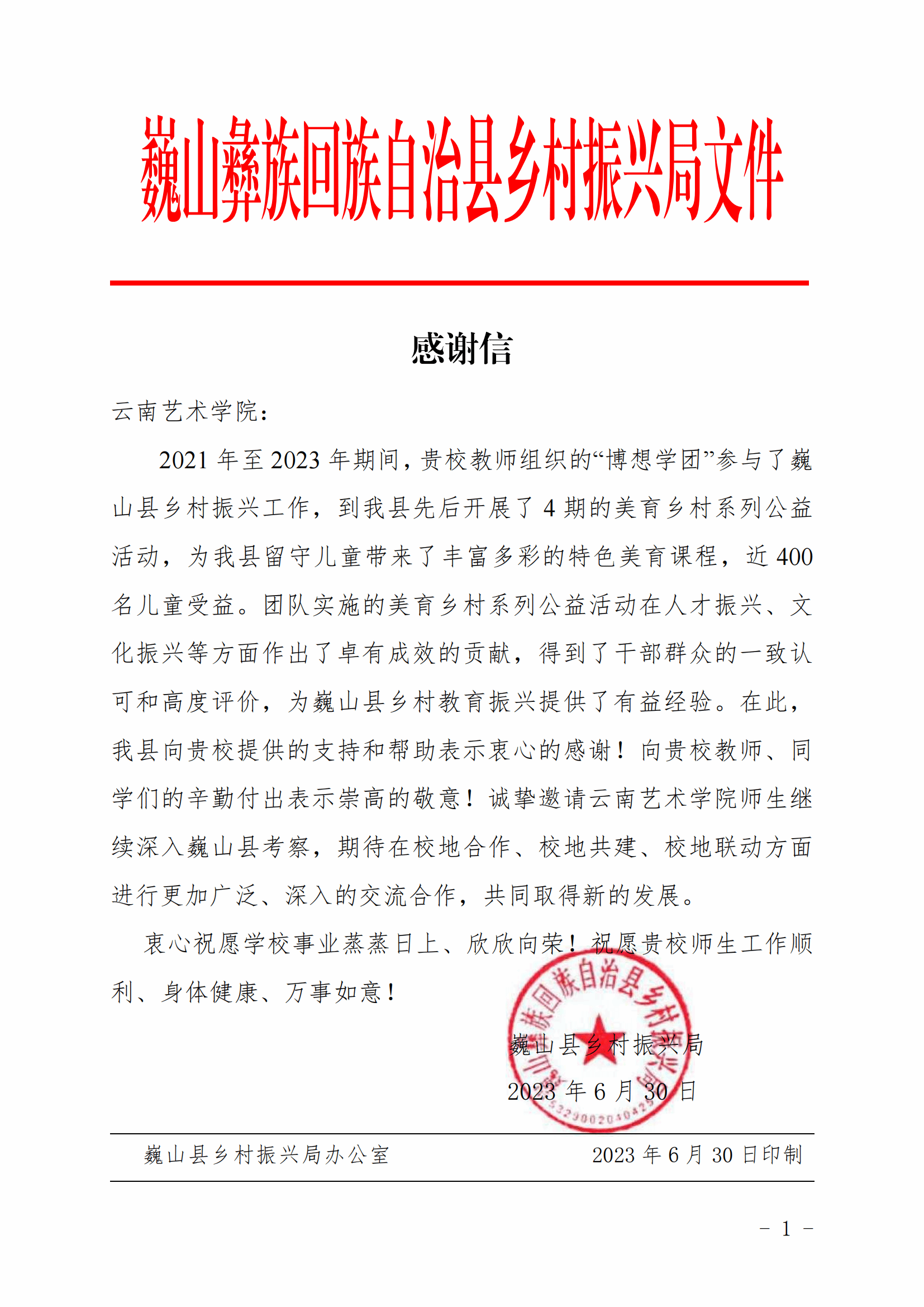 在云岭大地的怀抱中,beat365在线唯一官网登录设计学院始终秉持着“艺术服务社会,设计点亮生活”的初心,致力于将美育教育与乡村振兴的宏伟蓝图紧密相连。2021年,由beat365在线唯一官网登录设计学院产品设计系发起beat365在线唯一官网登录产品设计专业“博想学团”美育乡村系列公益活动。多年来,“博想学团”不仅扎根于云岭的深厚文化底蕴之中,更将这份文化精髓与现代设计理念相融合,为乡村的孩子们带来了前所未有的美育体验,用知识的光芒照亮孩子们的梦想之路,共同绘就乡村美育的新篇章。在此过程中,收到了来自大理州巍山彝族回族自治县乡村振兴局的感谢信,对学院表示衷心的感谢和崇高的敬意。
