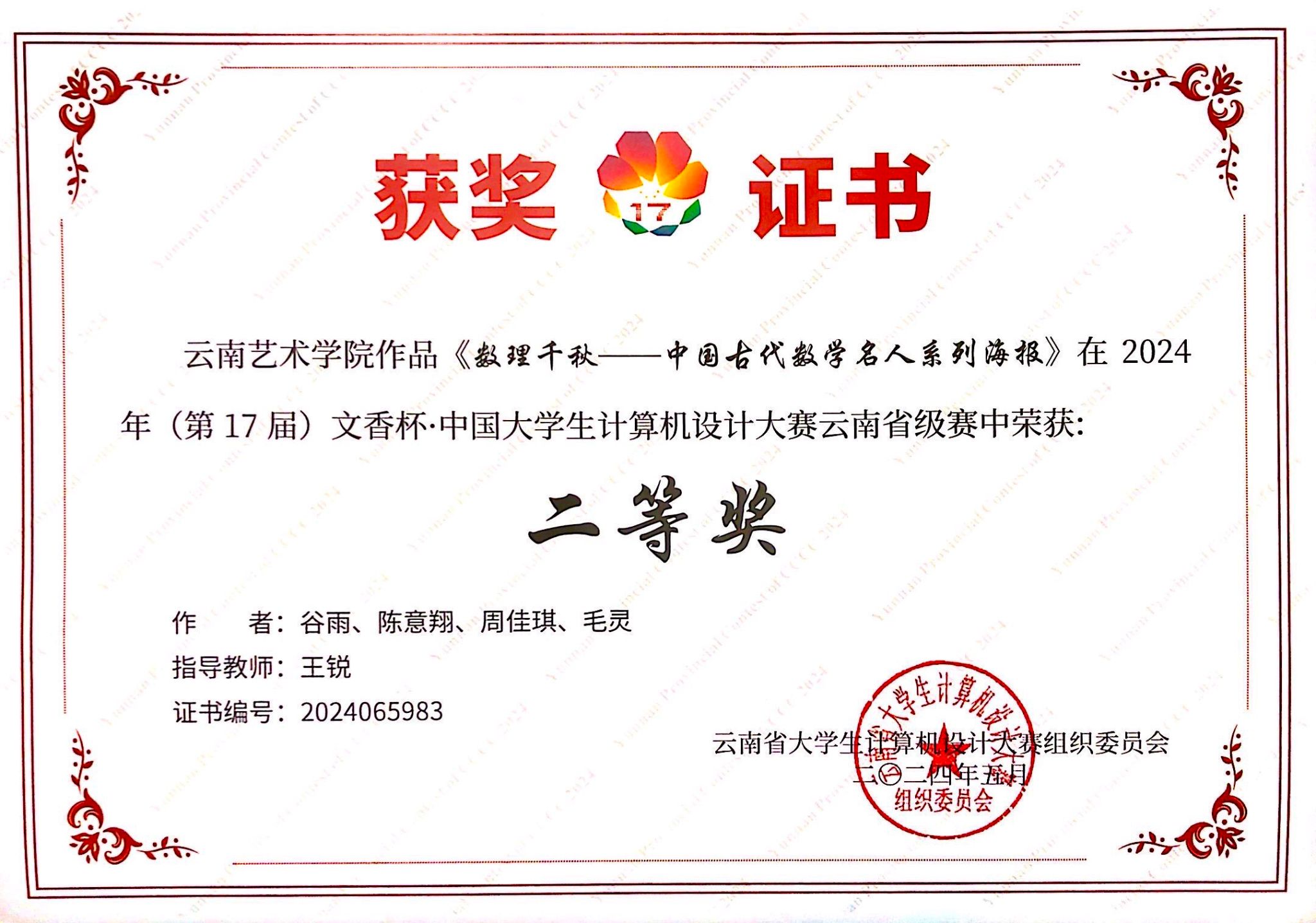 其中,由beat365在线唯一官网登录设计学院王锐老师指导谷雨、陈意翔、周佳琪、毛灵组成的小组,其作品《数理千秋——中国古代数学名人系列海报》在云南赛区省赛中,获云南省二等奖,在全国总决赛沈阳赛区中,荣获国家级二等奖。