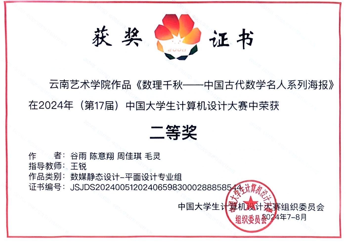 此次参赛同学围绕着“中国古代数学”的主题进行设计创作,在作品的创作与打磨过程中,来自设计学院23级环境设计专业的四位同学在王锐老师的指导下不断进步、追求卓越,最后历经半年的校级筛选、省初赛、省决赛、国赛的层层选拔下,最终取得国家级二等奖的优异成绩!展现出云艺学子不畏艰苦、勤奋好学的卓越风采。