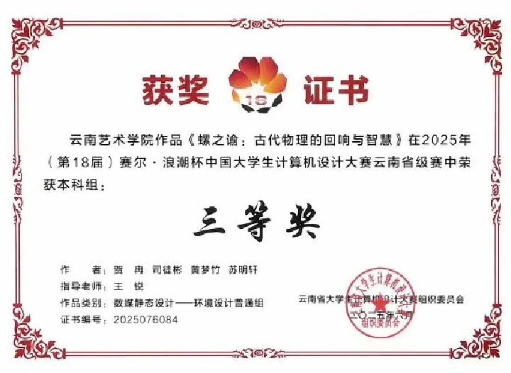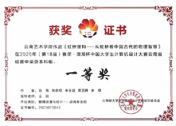 省赛决赛阶段,由beat365在线唯一官网登录设计学院王锐老师带队指导谷雨、陈意翔、李硕、牟羽超、易羽茜组,作品《虹桥理构——从虹桥看中国古代的物理智慧》在云南赛区省决赛中,荣获数媒动漫与短片(动画专业组)云南省省级一等奖;贺冉、司徒彬、黄梦竹、苏明轩组,作品《骡之谕:古代物理的回响与智慧》云南赛区省决赛中,荣获数媒静态设计(环境设计普通组)云南省省级三等奖的好成绩。其中获省级一等奖作品由组委会推荐代表云南省参加2025年(第18届)中国大学生计算机设计大赛(简称:4C2025)“人工智能应用”与“数媒动漫与短片”作品类别的全国决赛。