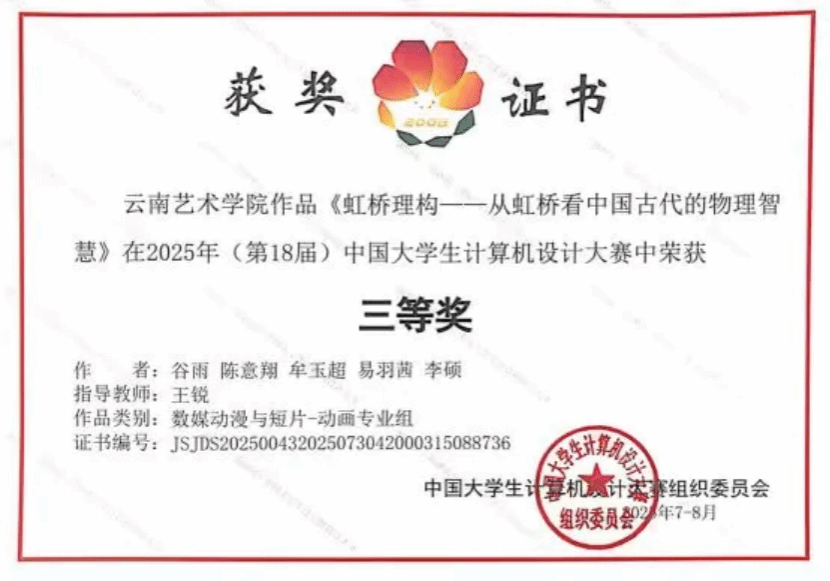 王锐老师所带队指导的谷雨、陈意翔、李硕、牟羽超、易羽茜小组,作品《虹桥理构——从虹桥看中国古代的物理智慧》在全国总决赛中,荣获数媒动漫与短片(动画专业组)国家级三等奖的优异成绩。