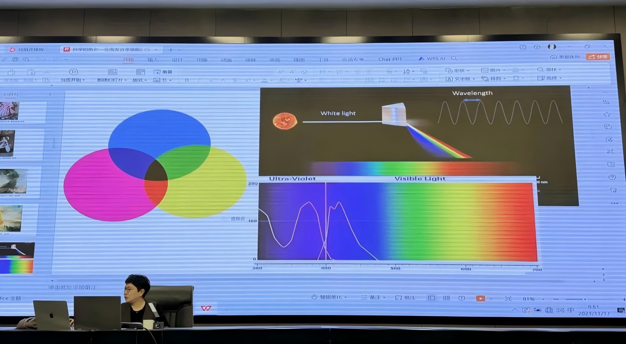 李辰教授以宏观的视角带领在场师生回望和梳理西方美术史中的艺术作品,总结出东西方文明在中国传统的“随类赋彩”,西方传统的固有色、冷暖互补,也会借鉴民间艺术的色彩配伍,以及设计艺术的色彩构成,这些都为壁画家乐于使用并熟练掌握的技巧。同时,借助案例分析详细解读科学视角下的色彩理论构建的全过程。