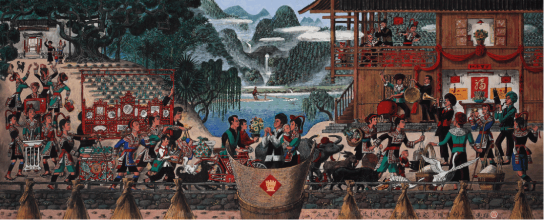 周令钊 《庆贺丰收喜迁新居(畲族入宅式)》 86.4cm×213.3cm 2010年
