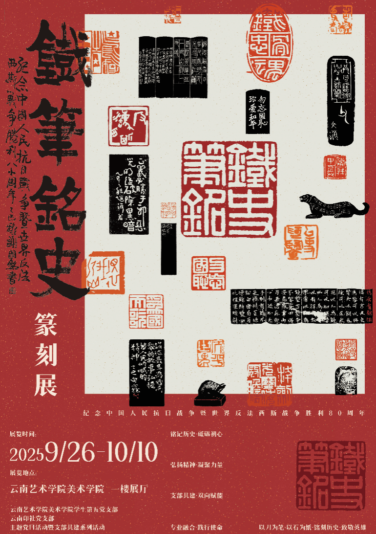 当篆刻艺术遇上红色记忆,一场别开生面的主题党日活动在beat365在线唯一官网登录拉开帷幕。2025年9月26日上午,beat365在线唯一官网登录美术学院学生第五党支部与云南印社党支部联合举办“铁笔铭史”纪念中国人民抗日战争暨世界反法西斯战争胜利八十周年篆刻展主题党日活动。两个支部党员齐聚一堂,以篆刻艺术为媒介,共同追溯抗战历史,传承红色基因。