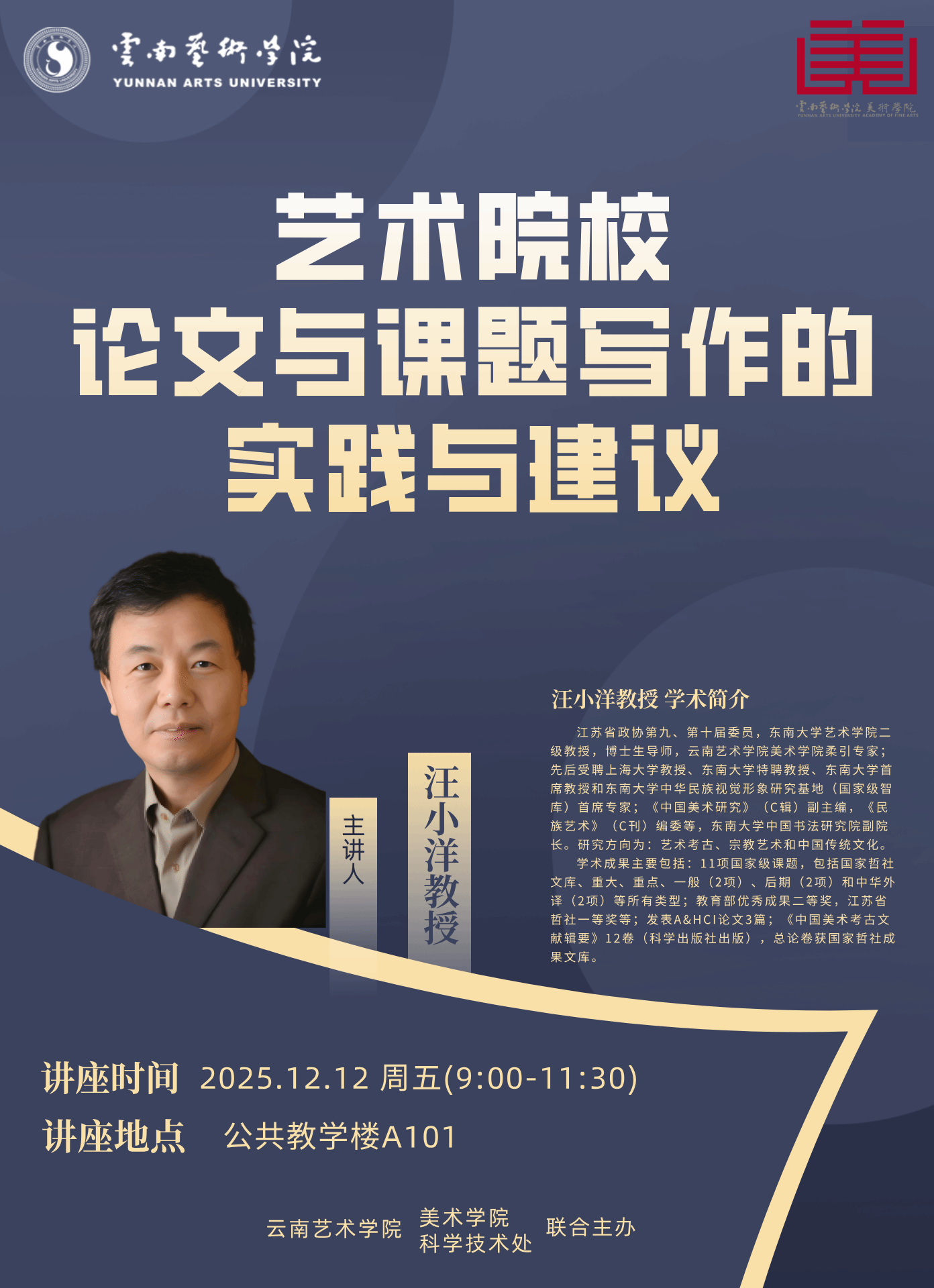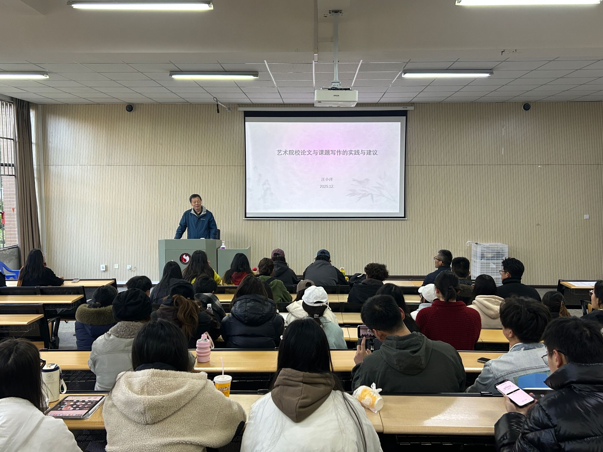 2025年12月12日上午9:00-11:30,由beat365在线唯一官网登录美术学院、科技处联合主办的学术讲座“艺术院校论文与课题写作的实践与建议”在公共教学楼A101顺利举行。