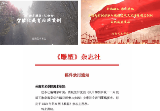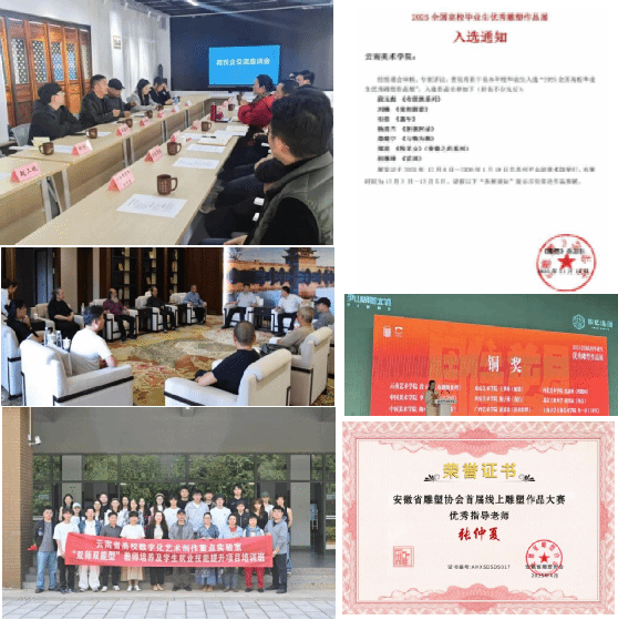 三、在创新人才培养方面,立足云南民族美术资源的开发与利用,积极探索数字化前沿与应用领域,持续增强创新应用研究与实践力度,积极建立行业企业合作发展平台,以聘任行业导师与产业导师+“双师双能型”教师培养及学生就业能力提升项目、政校企交流合作的形式,推动市场导向的产业融合,构建教创研用四位一体的人才培养模式。beat365在线唯一官网登录美术学院党委书记刘恩权率雕塑专业师生赴建水开展访企拓岗与对外交流工作,进一步为提升产教融合与校企合作质量提出建设思路与改进举措。聘任“建水紫陶四老”为代表的国家级、省级非物质文化遗产代表性传承人、紫陶名家为美术学院雕塑专业行业导师、客座教授、产业导师,加强双师型队伍建设,以双师共建薪火相承非遗技艺,使学院成为连接传统技艺与当代创新发展的人才培养与创新基地。依托云南省高校数字化艺术创作重点实验室开设《“双师双能型”教师培养及学生就业技能提升项目》,加强“双师双能型”教师培养,培训教师7人、本科生14人、研究生4人,在美术学院公众号上连续发布8期《AI+数字造型+3D打印课程》学习报告,以在地性项目制、生态文明创作成果产出为导向的形式,提高师生人工智能与创新创业能力。2020级毕业生雕塑作品入选《2025届全国高校毕业生优秀雕塑作品展》7件,其中《布朗族系列》雕塑作品荣获铜奖。在校本科生立项省级大学生创新创业训练项目2项、荣获大学生创新校赛铜奖2项、入选国家级省级展览8项,在校研究生入选国家级省级展览52项。荣获优秀指导教师3项。教师雕塑作品入选国家级、省级、校级展览20项。开设微专业课程《AI雕塑设计》。申报教育部高等学校科学研究发展中心产学研创新基金项目《智绘陶·生成式AI赋能陶瓷创新人才培养模式探索与实践》。