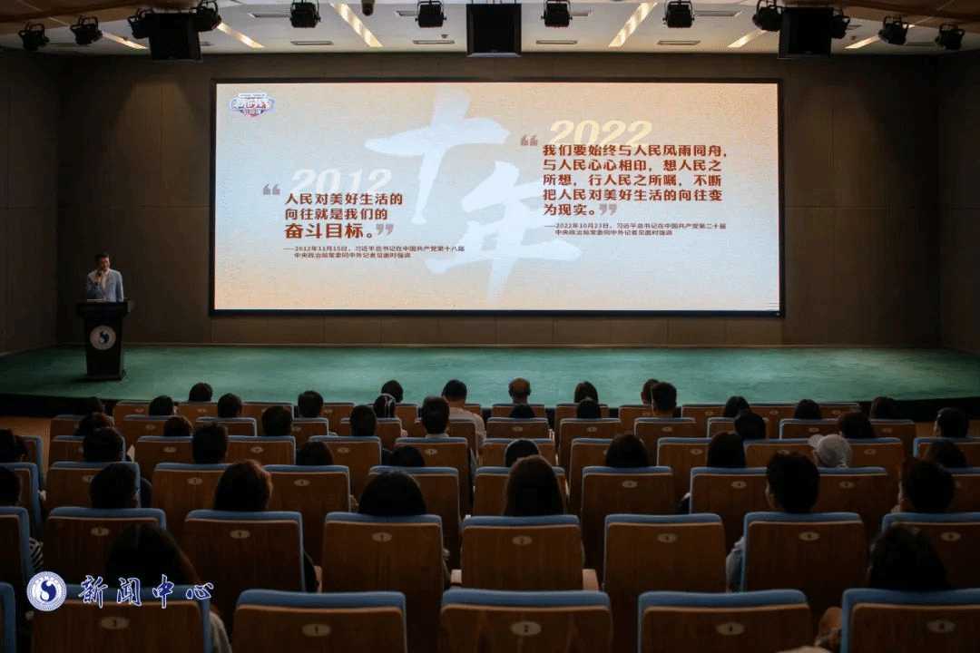 新时代公开课由戏剧学院播音系主任、主任播音员王旭东主讲,以“宣讲+串讲+音视频播放”的形式,巧妙地把习近平总书记的重要论述和全国各行各业涌现的为时代进步、社会发展、人民幸福奉献奋斗的时代英雄感人事迹融为一体,以身边故事阐释科学真理,以新时代的生动实践,深刻阐述习近平新时代中国特色社会主义思想的真理伟力。