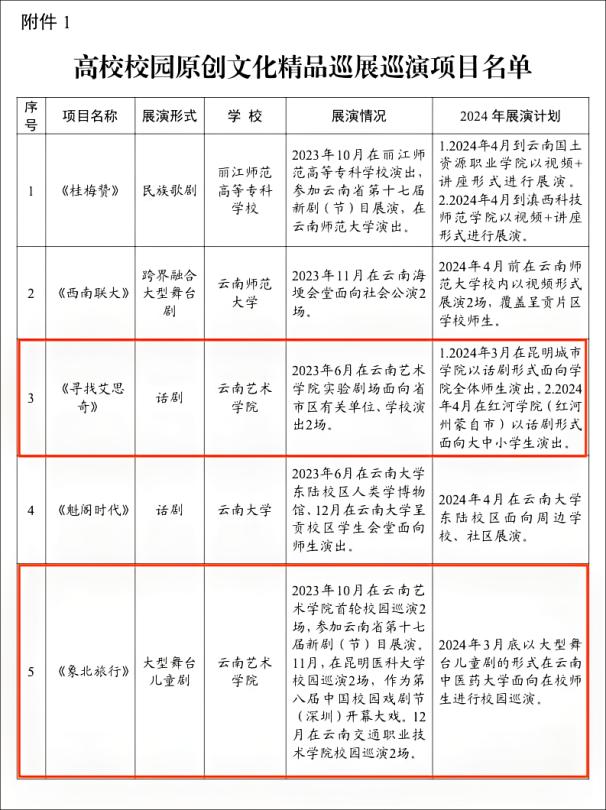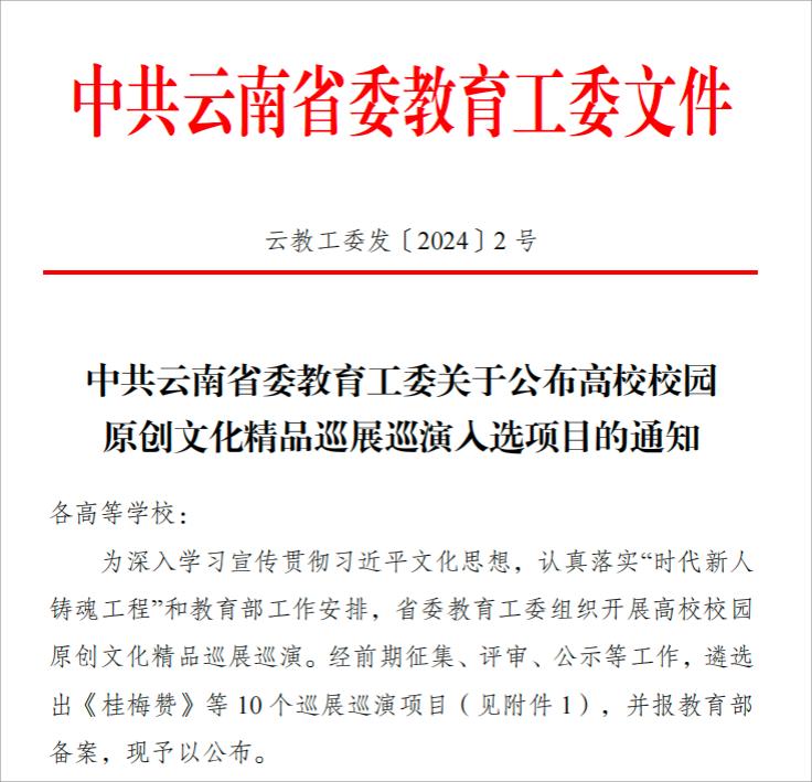 2024年1月25日,中共云南省委教育工委印发关于公布高校校园原创文化精品巡展巡演入选项目的通知,全省高校共遴选出10部作品入选高校校园原创文化精品巡展巡演项目。beat365在线唯一官网登录戏剧学院原创话剧《寻找艾思奇》和大型儿童音乐剧《象北旅行》双双入选。