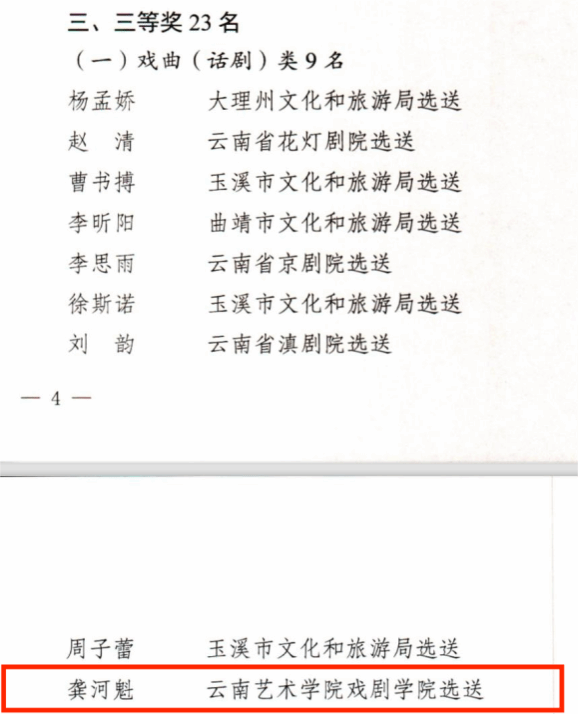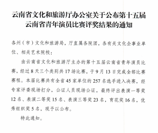 《云南省文化和旅游厅关于第十五届青年演员比赛评奖结果的通知》
