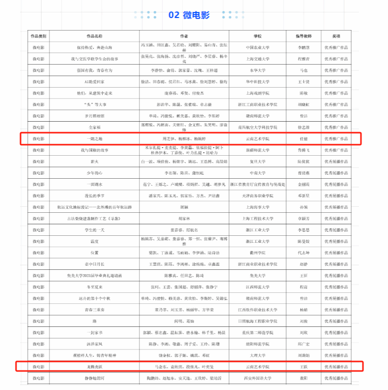 学校高度重视该项活动,广泛动员师生积极参与,在此前进行的第七届云南省大学生网络文化节中电影电视学院共有16件作品入选,并同时斩获奖项16项。其中,“微电影类”获一等奖2个,二等奖1个,三等奖3个;“公益广告视频”获一等奖1个,二等奖1个;“微视频”获一等奖1个,二等奖2个,三等奖2个;“摄影类”获三等奖2个;“学生网文类”获二等奖1个。