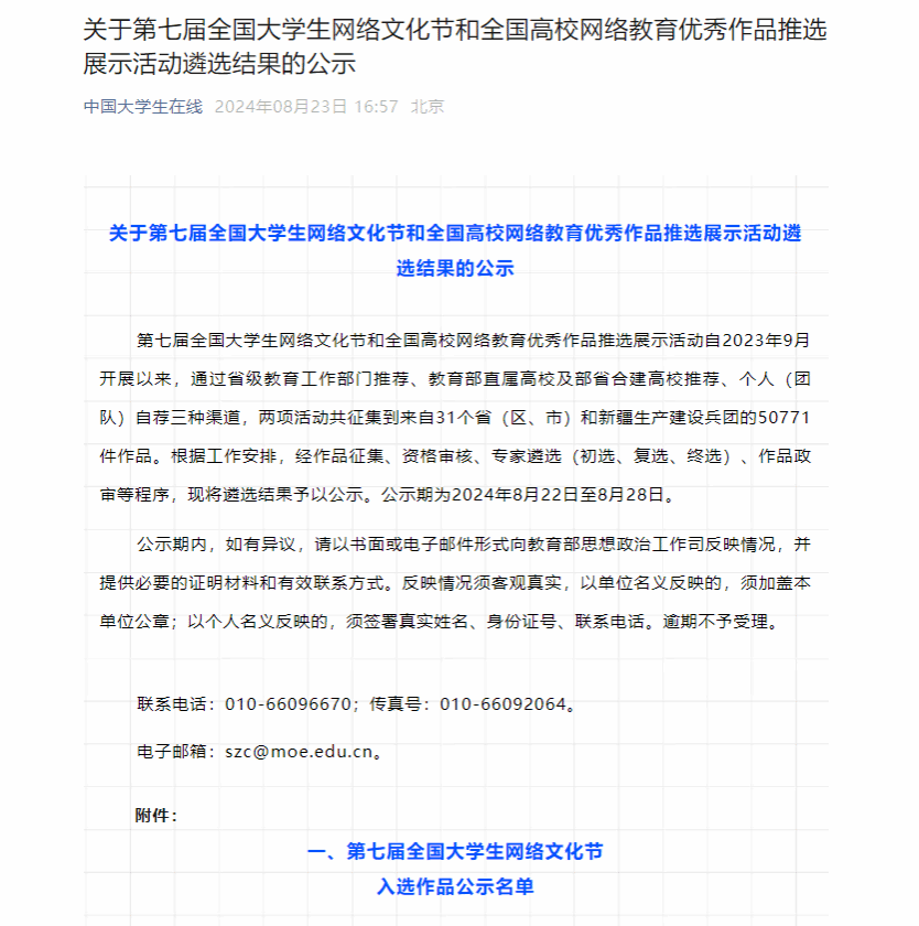 全国大学生网络文化节由教育部思想政治工作司、中央网信办网络社会工作局主办,是全国高校网络思政领域级别最高、覆盖面最广的竞赛之一,也是全国高校网络思想政治教育典型成效的重要展示平台。第七届全国大学生网络文化节以“争做校园好网民,汇聚网络正能量,挺膺担当建新功”为主题,旨在扩大高校网络文化影响力,推进网络文明建设。此次共设置优秀推广作品奖、优秀展播作品奖、优秀推荐作品奖、优秀入围作品奖等奖项。
