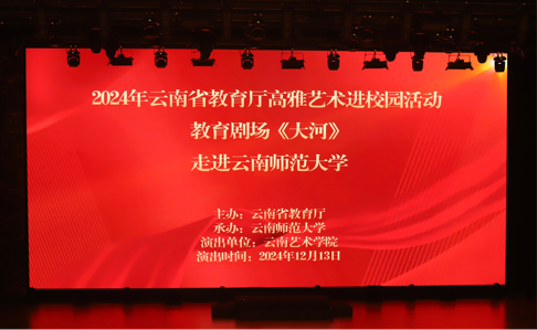 为进一步深入学习贯彻习近平新时代中国特色社会主义思想,全面贯彻党的教育方针,深化美育浸润行动,丰富校园文化活动,12月13日晚,2024年云南省教育厅高雅艺术进校园活动——教育剧场原创作品《大河》走进云南师范大学,在呈贡主校区学生实训中心一楼多功能厅精彩上演。