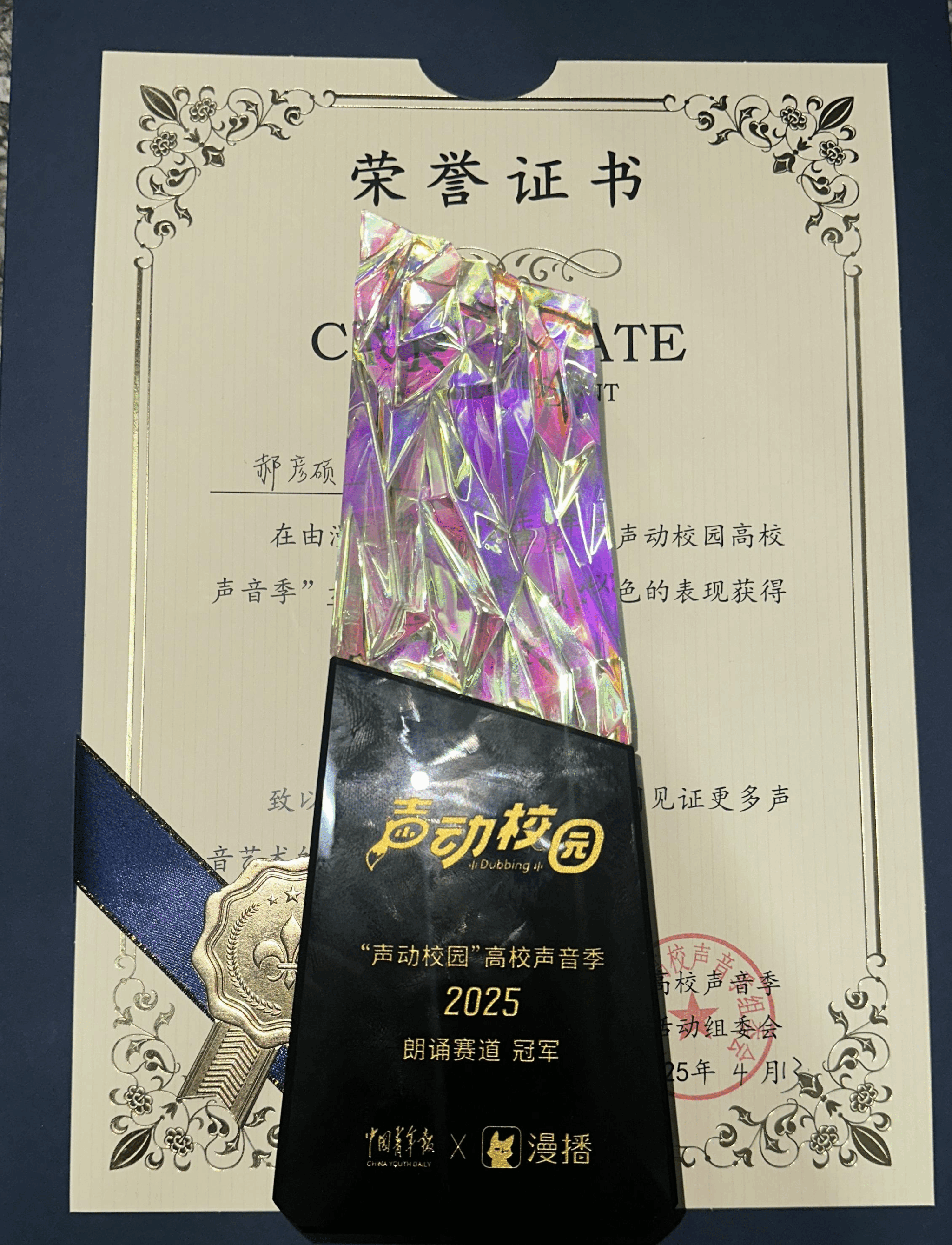 郝彦硕同学荣获“声动校园”高校声音季全国朗诵赛道冠军奖杯以及云南省赛区冠军荣誉证书