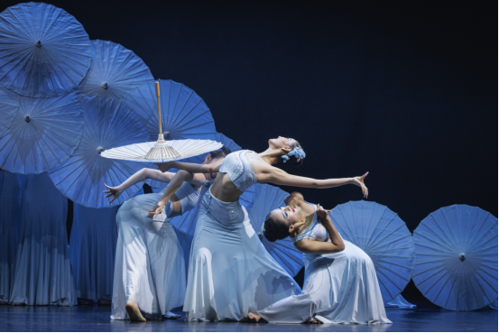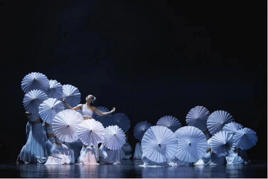 舞蹈《生命的摇篮》营造了“林”深、“雀”行、“象”鸣、“鱼”跃、“菌”生、“虫”荧的整体意境,人以“天地与我并生,而万物与我为一”的生命通感,融于舞蹈动作语汇的设计和舞蹈道具的形象塑造中。“伞”成为了这种生命通感得以联结的逻辑起点,它不仅以静态的伞面、伞柄表达出生命向内、向外两种方向的打破,还以将开未开、闪烁开合的动态伞面营造出呼吸感。这种呼吸是自然的轮回,是人的吐纳,是齐物论下的生命共振,是天人同道的生命跃动。(作者:于港,中央民族大学)