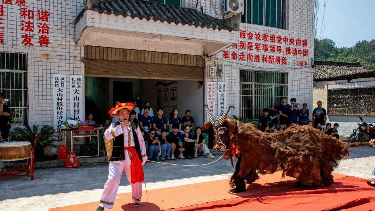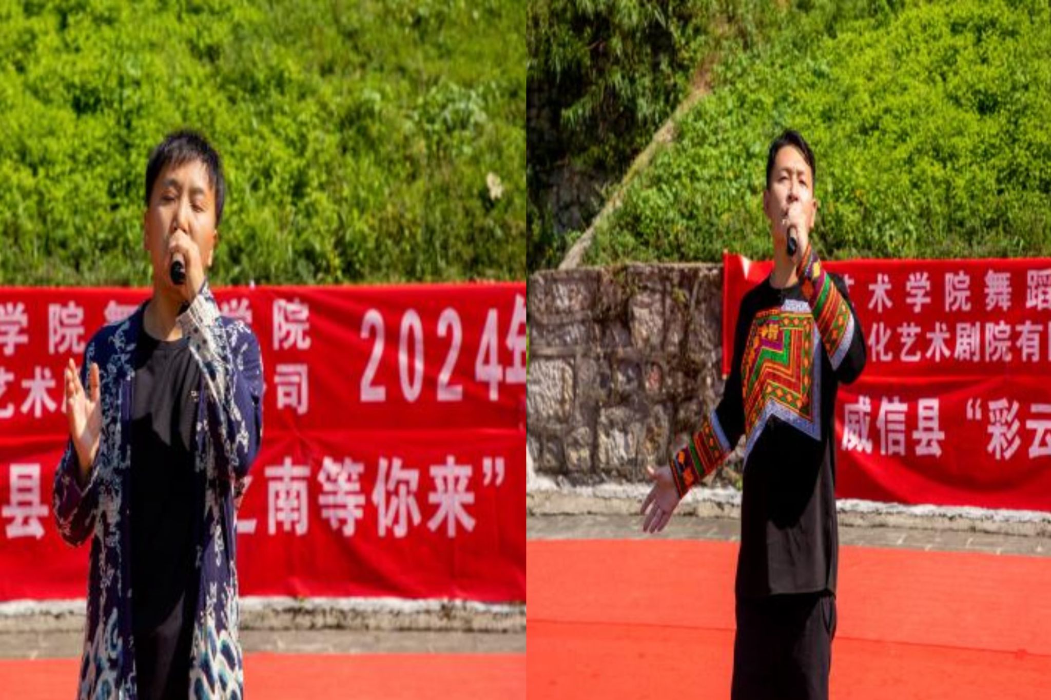 演出间隙,师生还观看和学习了威信县扎西镇大山村传统民间歌舞(剧)“莲枪”、“牛灯”,高田乡国家级非物质文化遗产保护项目代表性名录“关公戏”以及民间小调表演,参观了高田乡文化站农耕文化、红军革命历史文化、关公戏文化展览馆以及扎西文苑,深入了解学习当地非遗蜡染和苗族彝族同胞的生产劳作、服饰文化、民风民俗等。现场访谈了当地的民间艺人和文化工作者,双方就乡村传统民间歌舞(剧)的现状、传承发展以及创新等进行了深入的交流和探讨,对如何传承和弘扬乡村传统民族民间文化,促进文化赋能,实现文化反哺经济发展,助力乡村振兴提出了意见和建议。