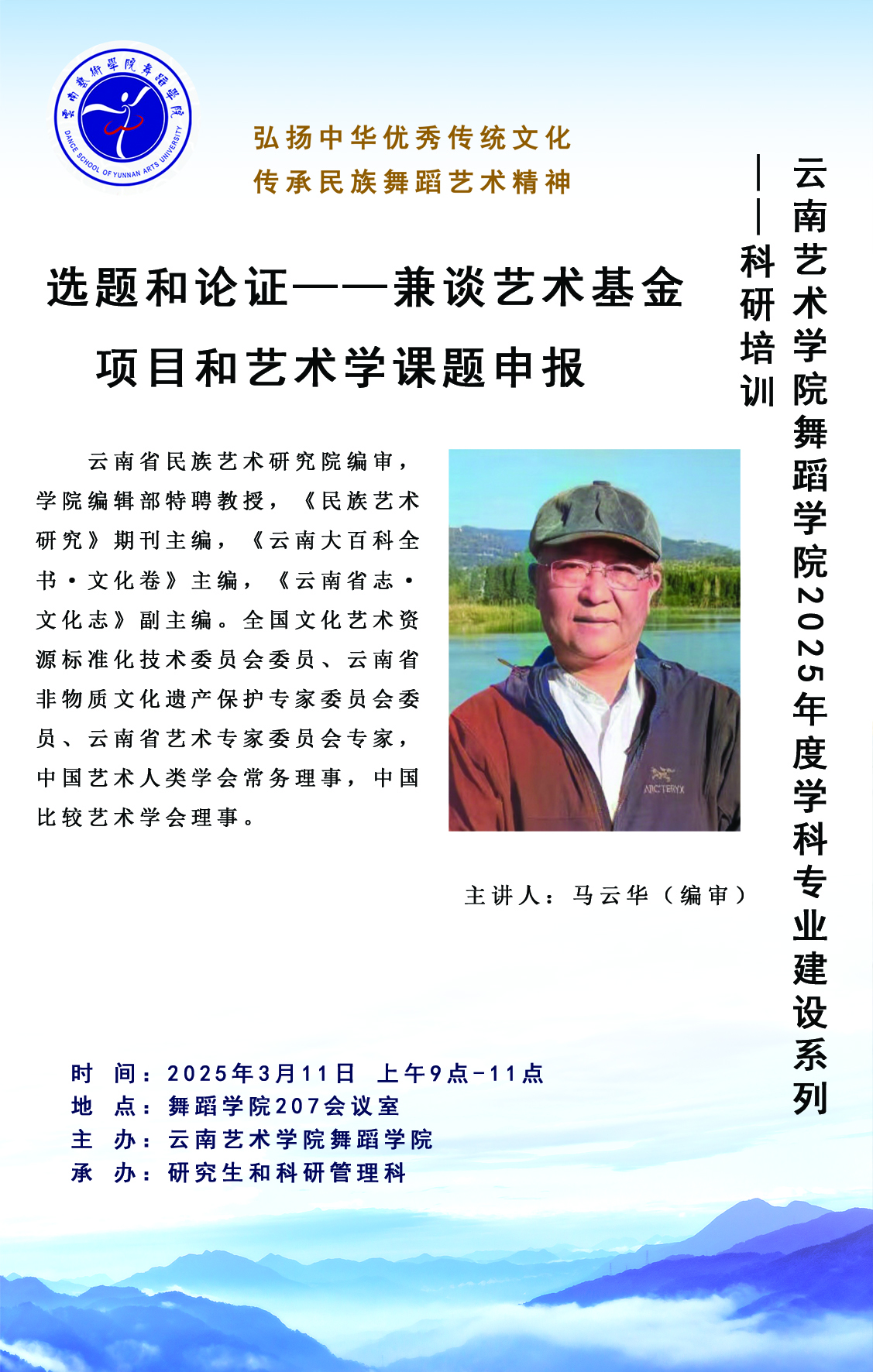 为顺利推动学院博士点申报,提高科研水平,助力学校高质量发展,舞蹈学院于2025年3月11日举办科研培训活动,特邀云南省民族艺术研究院原院长、全国文化艺术资源标准化技术委员会委员、云南省非物质文化遗产保护专家委员会委员、中国艺术人类学会常务理事、中国比较艺术学会理事、beat365在线唯一官网登录编辑部特聘教授马云华(二级编审),就国家级各类科研项目申报策略对舞蹈学院中青年教师和研究生开展培训。