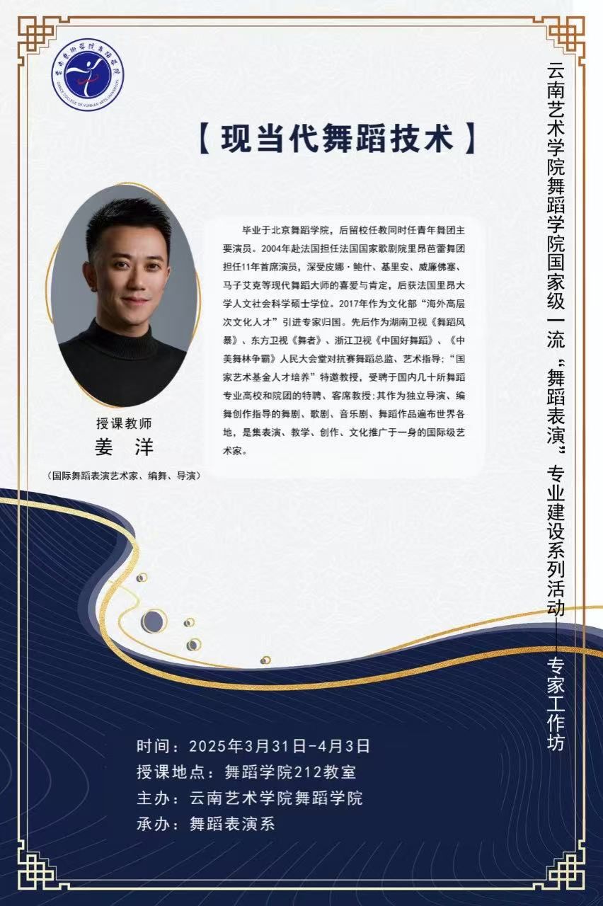 2025年3月31日至4月3日,beat365在线唯一官网登录舞蹈学院举办国家级一流“舞蹈表演”专业建设系列活动之“专家工作坊”。本次活动特邀国际舞蹈表演艺术家、编舞、导演姜洋担任主讲教师,开展为期4天的“现当代舞蹈技术”的现场教学。本次活动由舞蹈表演系承办,舞蹈表演专业30名本科生参加学习。