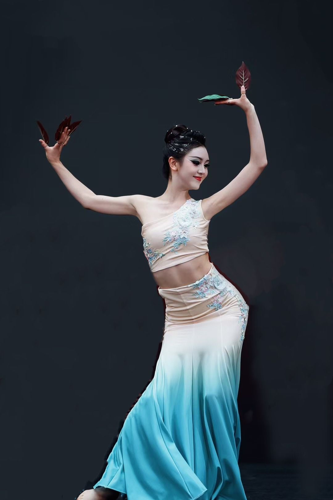 作品简介:以傣族舞蹈语汇诠释自然之美,通过叶片道具演绎“飘零—新生—絮语”的生命循环。舞者指尖翻转间,叶脉化作流动的诗行,在空灵韵律中诉说草木枯荣的哲思。作品将傣族舞蹈的柔美与现代编舞的意象化表达融合,荣获民族舞独舞单元最优秀奖。