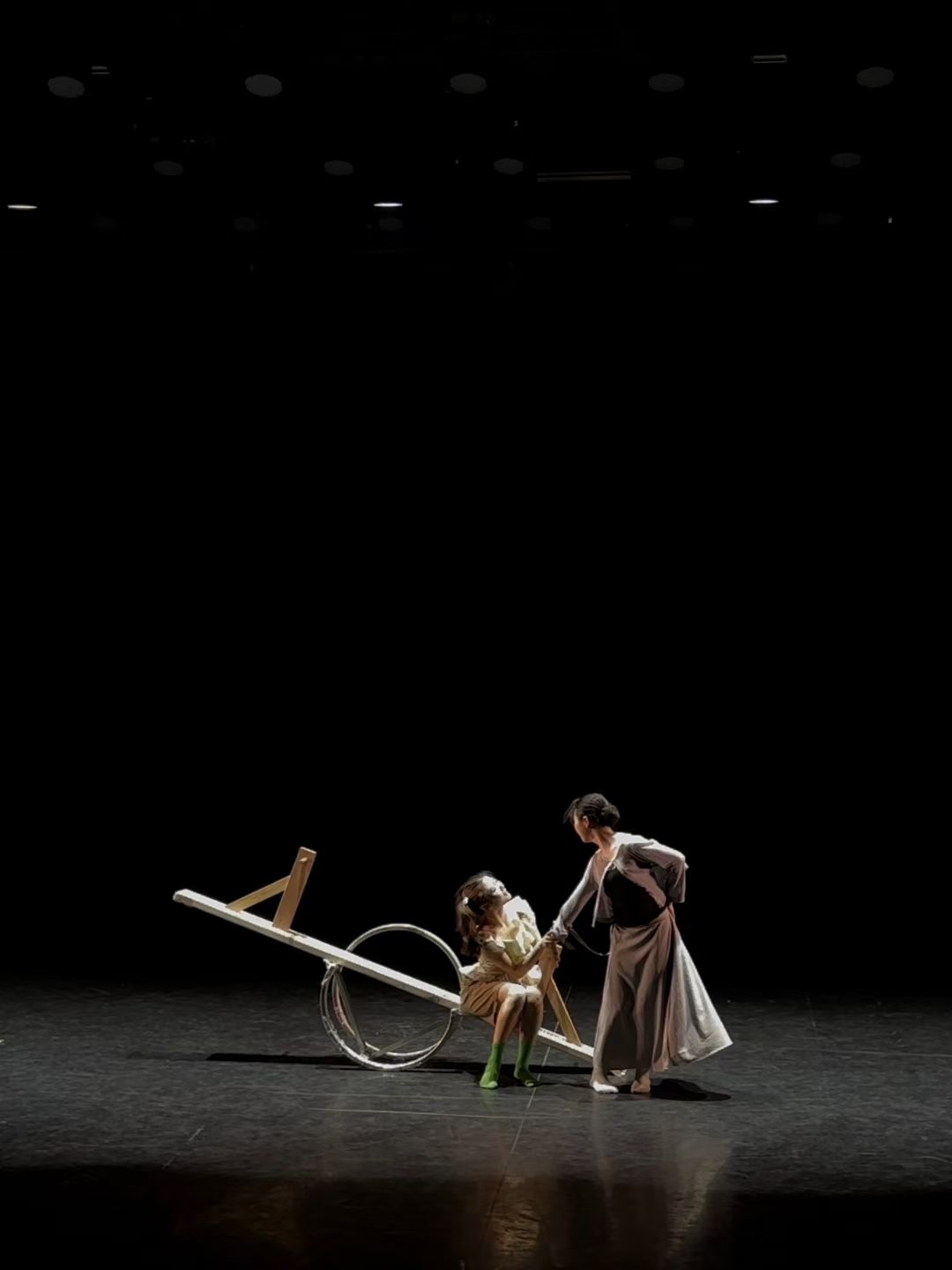 作品简介:聚焦二胎家庭的情感平衡,以跷跷板为核心意象,通过诙谐律动的舞蹈语言展现孕期母亲与孩子的关系张力。作品将“度”的抽象哲理融入生活场景,通过双人舞的力量对抗与协作,引发观众对家庭关系、情感边界的思考,荣获现代舞团体大学部女子组银奖。